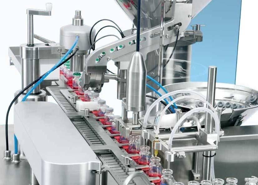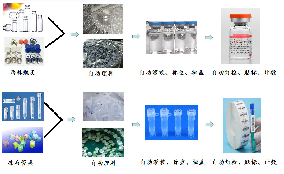 此類設備可實現西林瓶&凍存管料倉儲料—>自動理料供料—>自動檢測空瓶—>自動定位—>自動灌裝—>自動燈檢異物—>自動供瓶蓋—>自動預裝瓶蓋—>自動擰蓋—>自動打標貼標—>CCD檢測擰蓋及貼標效果—>自動計數出料緩存—>自動碼盤裝箱等一系列動作,使該類產品的灌裝擰蓋貼標工序實現完全自動化,提升產能及品質,節省人工。