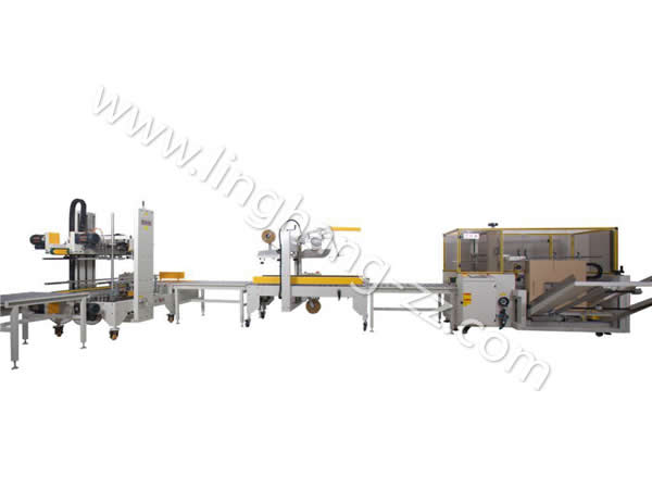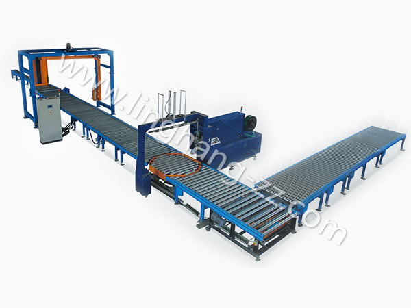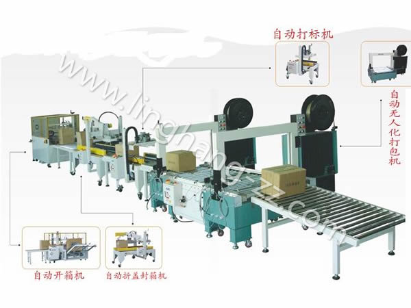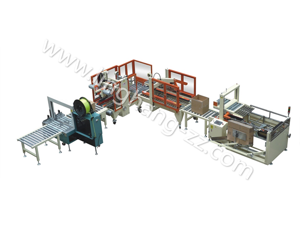 第四步:封好箱后自動打包,至此本流水線包裝操作完成。如在第一步與第二步間加入產品自動裝箱,屆時本包裝流水線將可以完全實現無人全自動從開箱到打包好。